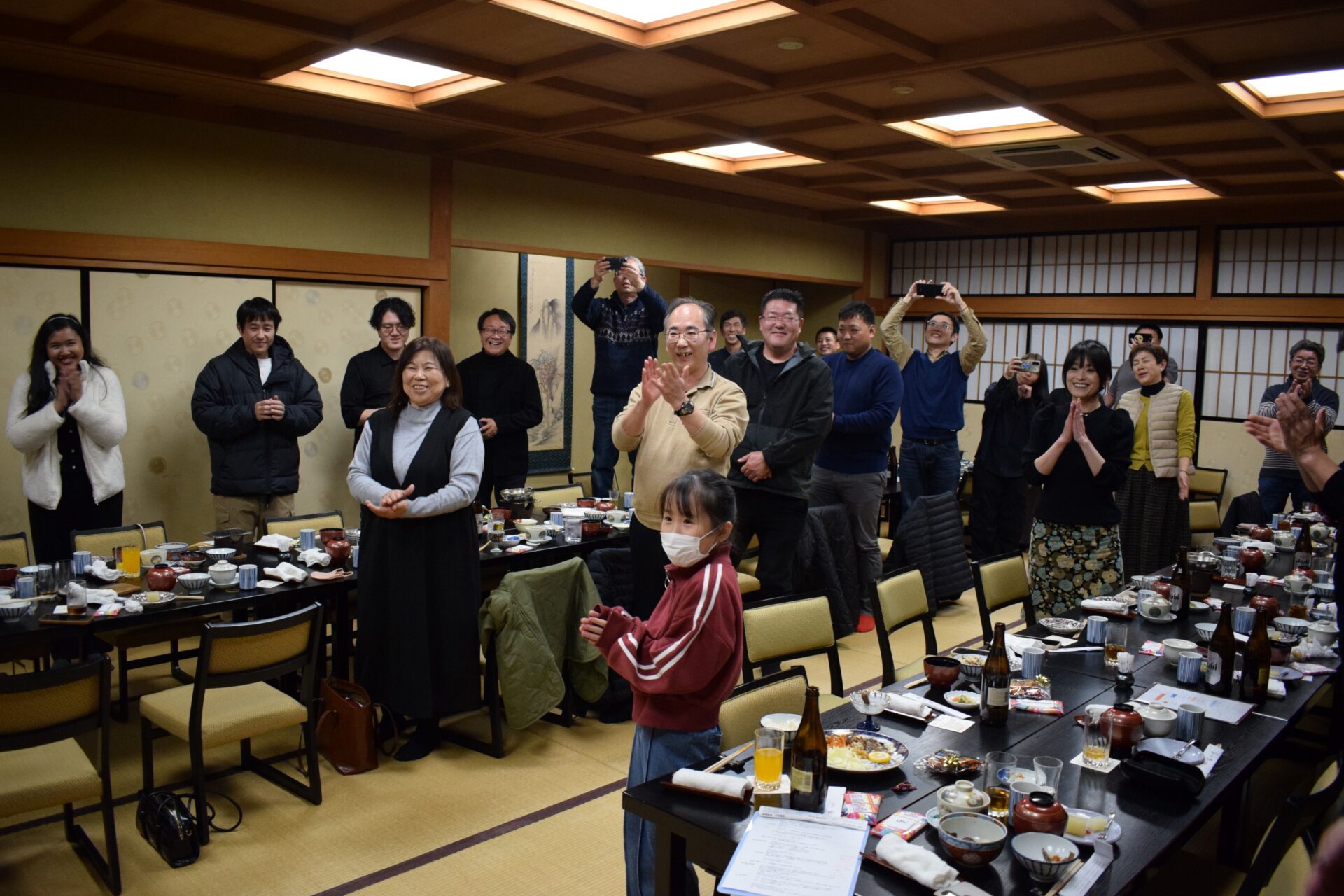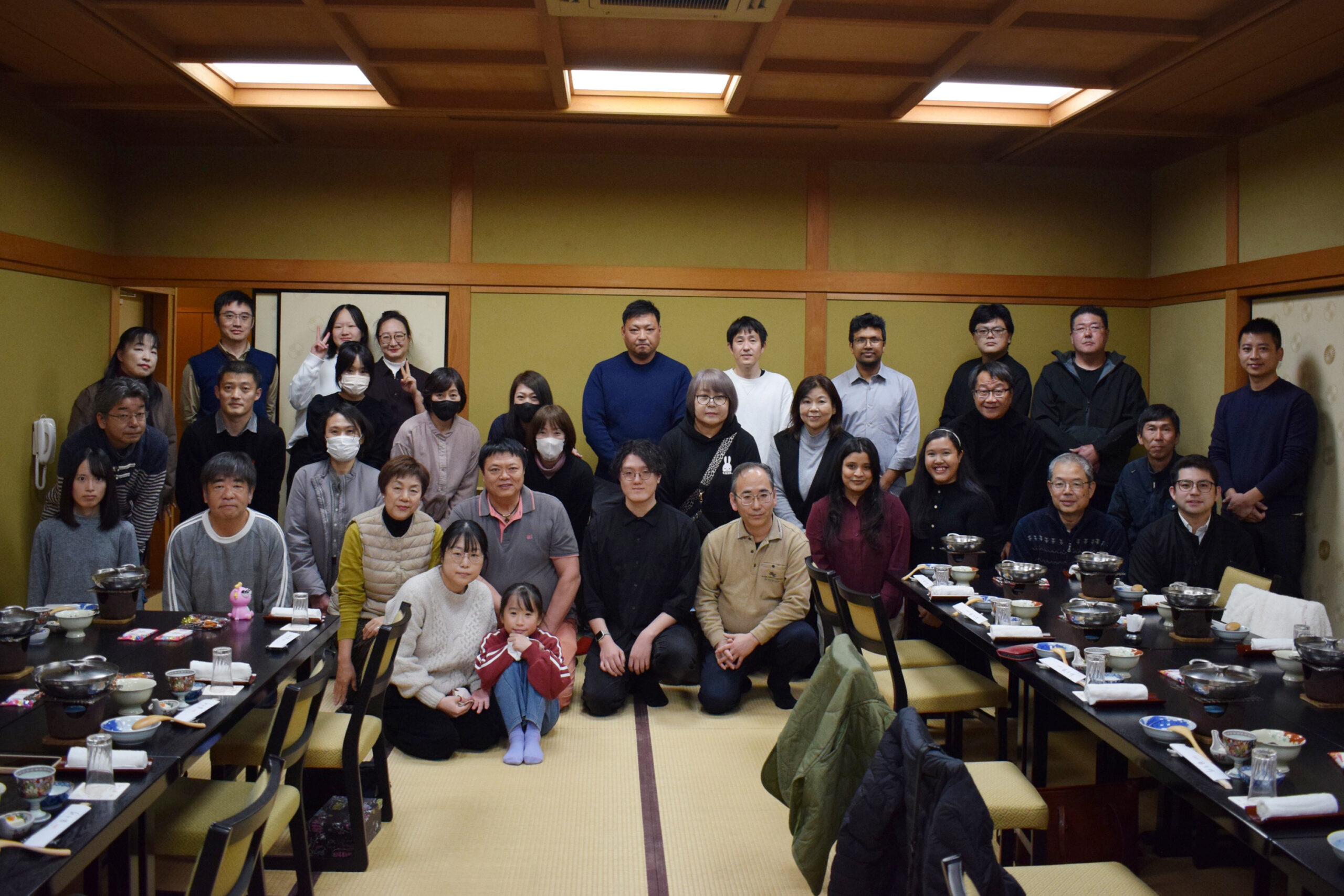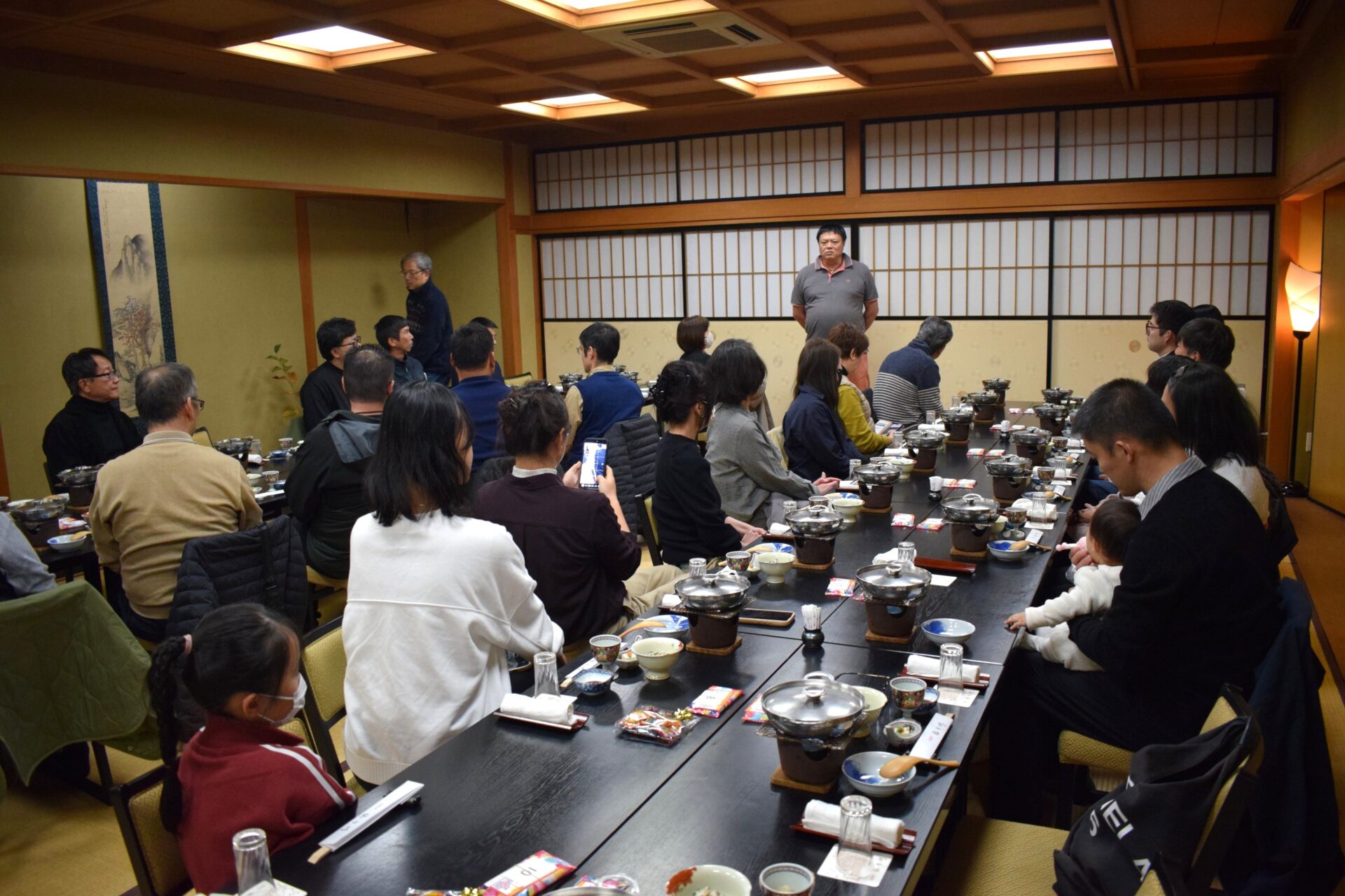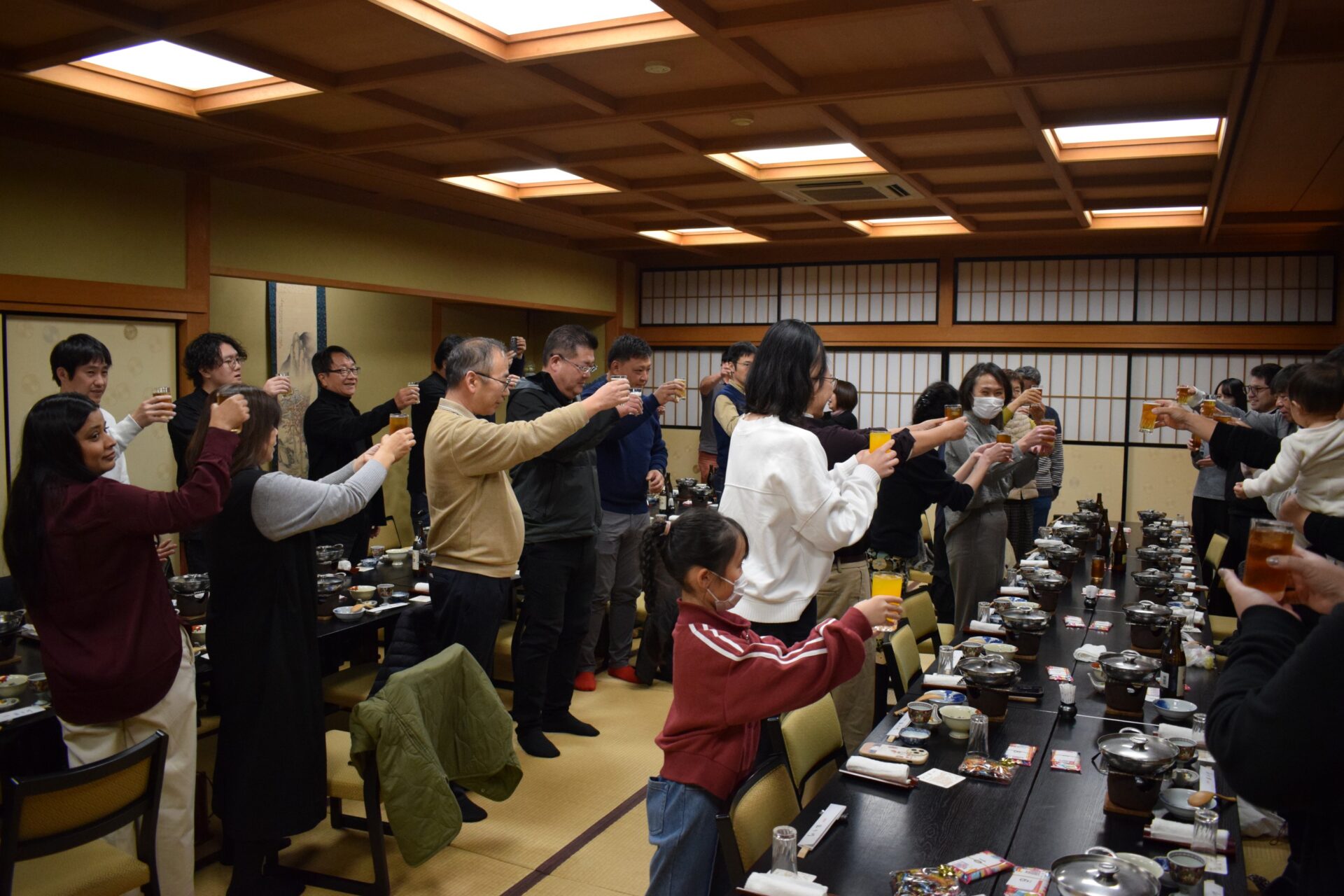 酔いが回る前に全員でパシャリ。代表の挨拶と乾杯で幕を開け、新人のフレッシュな自己紹介や各グループの来年の目標発表もあり、真面目さと楽しさが絶妙にミックスされた時間に。