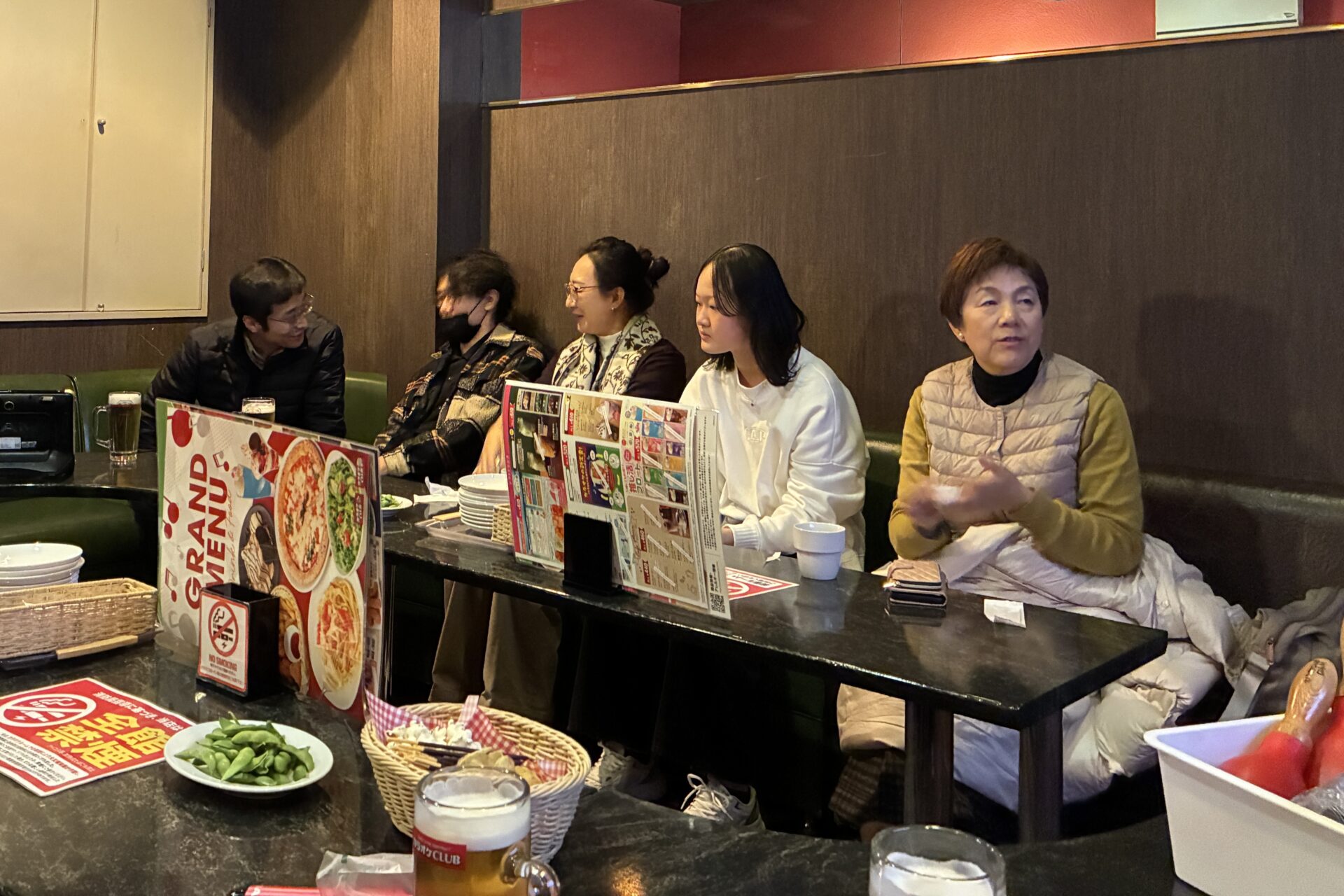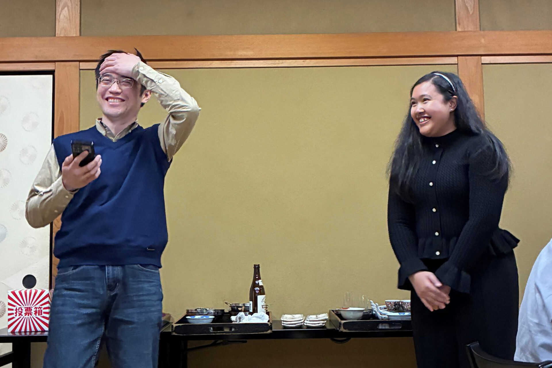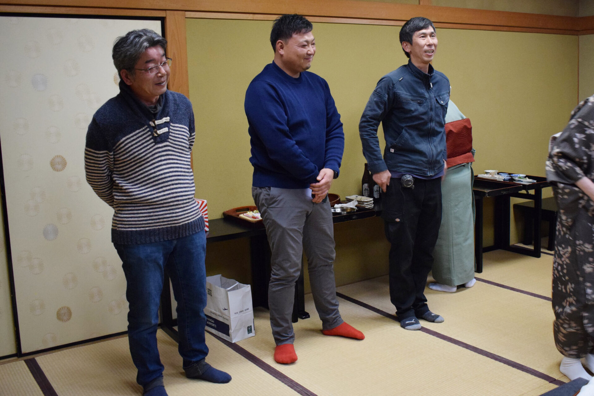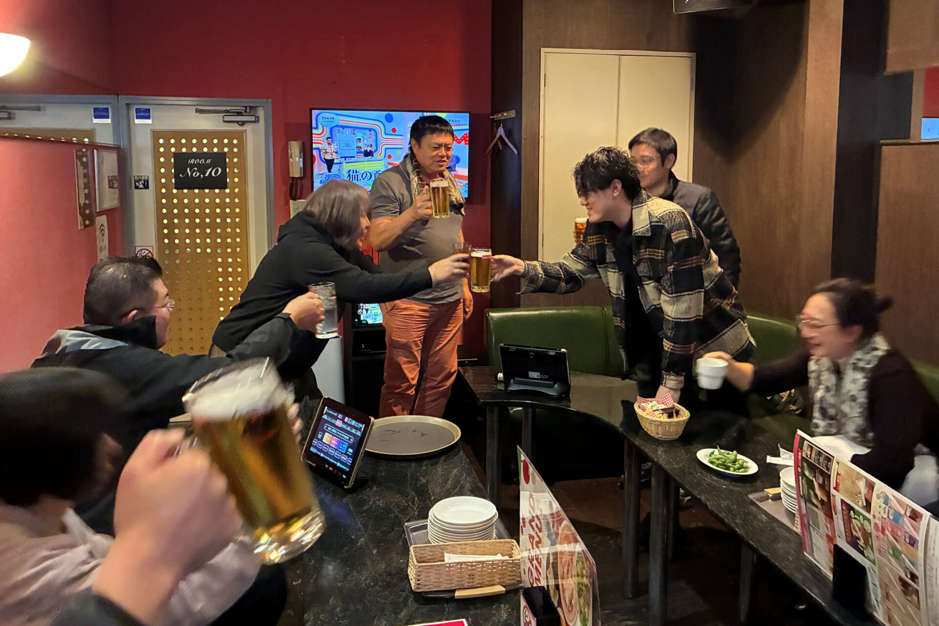酔いが回る前に全員でパシャリ。代表の挨拶と乾杯で幕を開け、新人のフレッシュな自己紹介や各グループの来年の目標発表もあり、真面目さと楽しさが絶妙にミックスされた時間に。